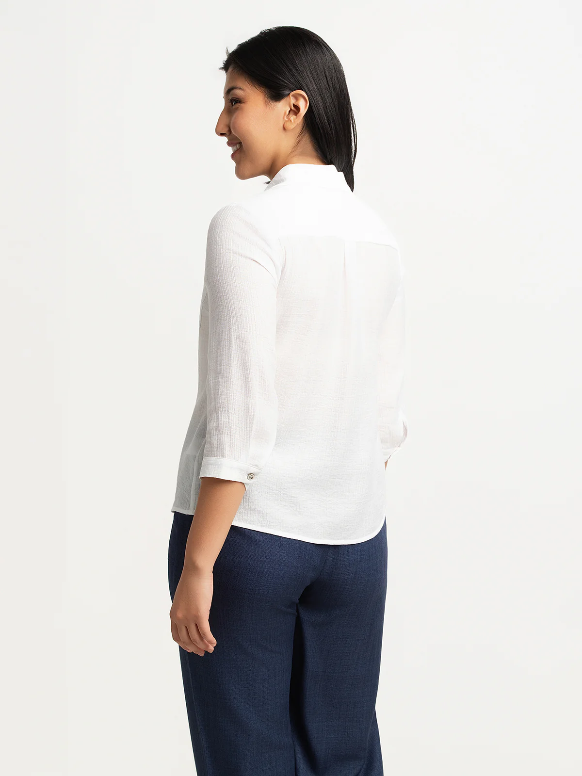Blouse à manches 3/4 en tissu tissé léger à texture légèrement froissée. Elle présente un col chemise, une patte de boutonnage centrale avec inscription ainsi qu'une poche plaquée.