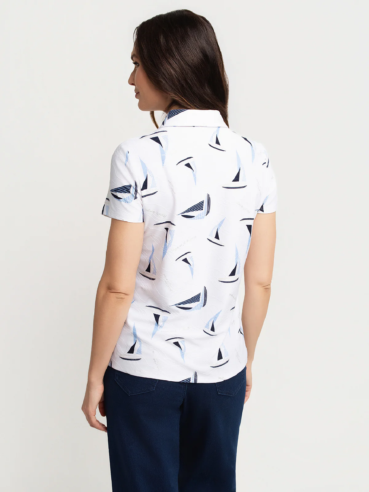 Blouse à manches courtes avec col chemise classique et patte de boutonnage centrale. Le modèle présente un motif de voiliers contrasté et une structure légèrement texturée.