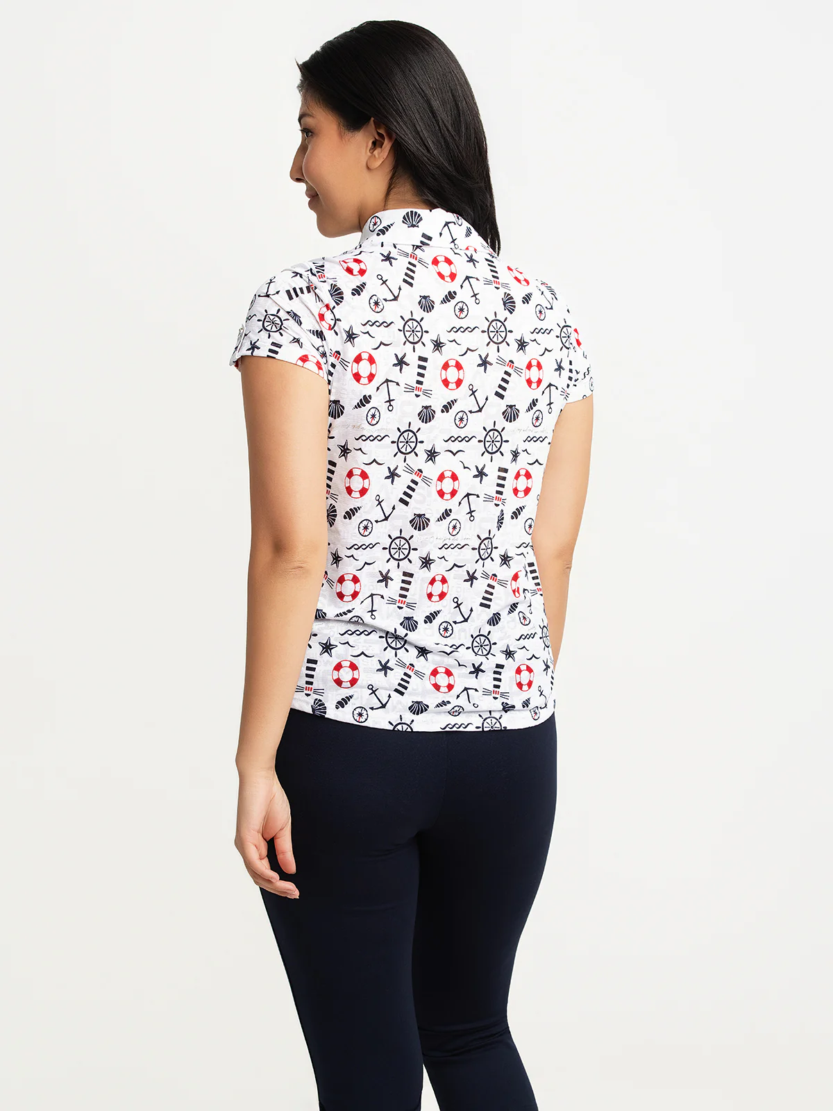 Blouse à manches courtes en tissu tissé léger ornée d'un motif à symboles marins contrastés. Elle présente un col chemise, une patte de boutonnage centrale et une coupe ajustée avec ourlet arrondi.
