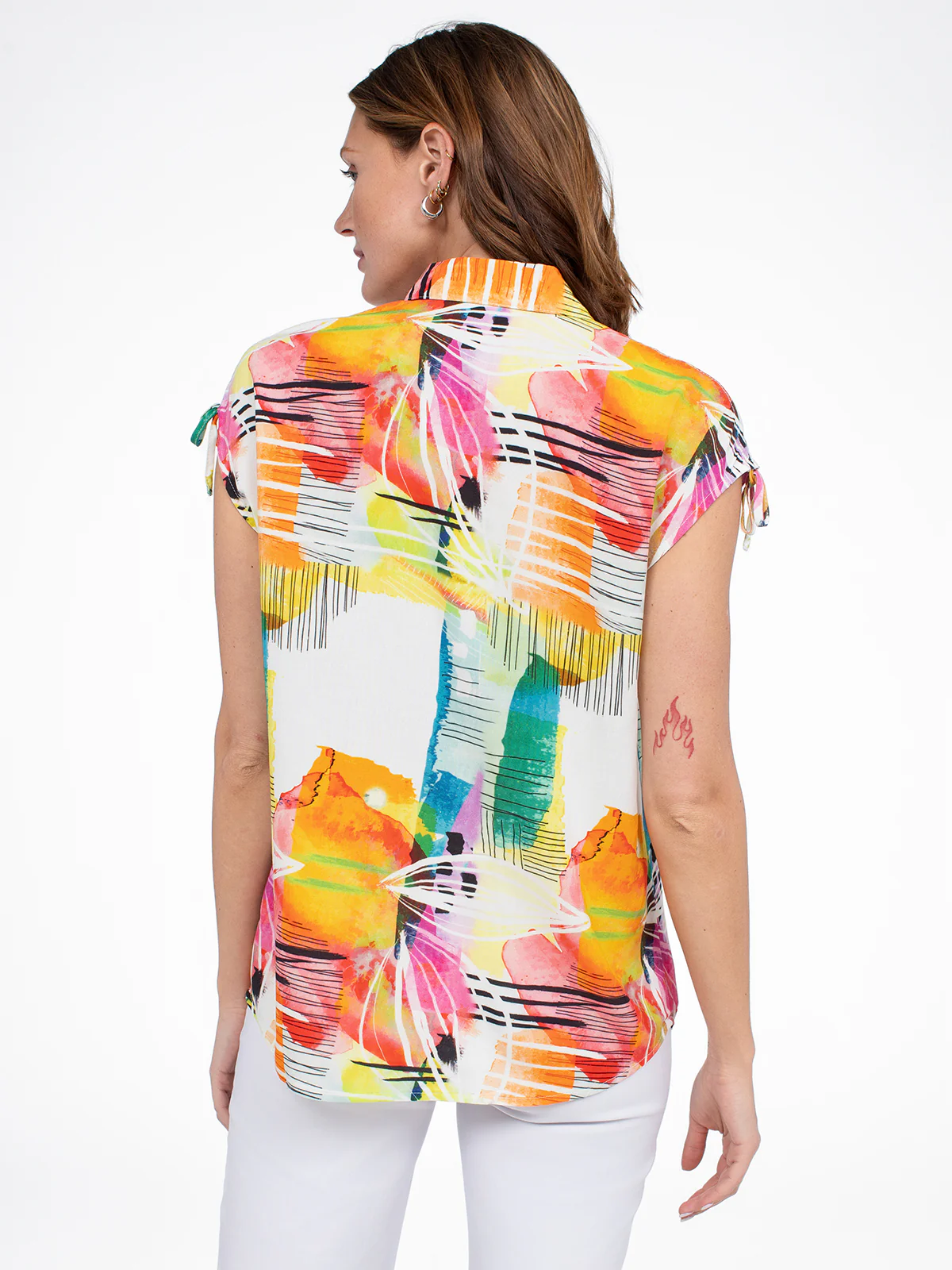 Blouse ample à manches courtes avec liens décoratifs sur les épaules et col chemisier. Son tissu léger est rehaussé d’un motif artistique aux nuances éclatantes.