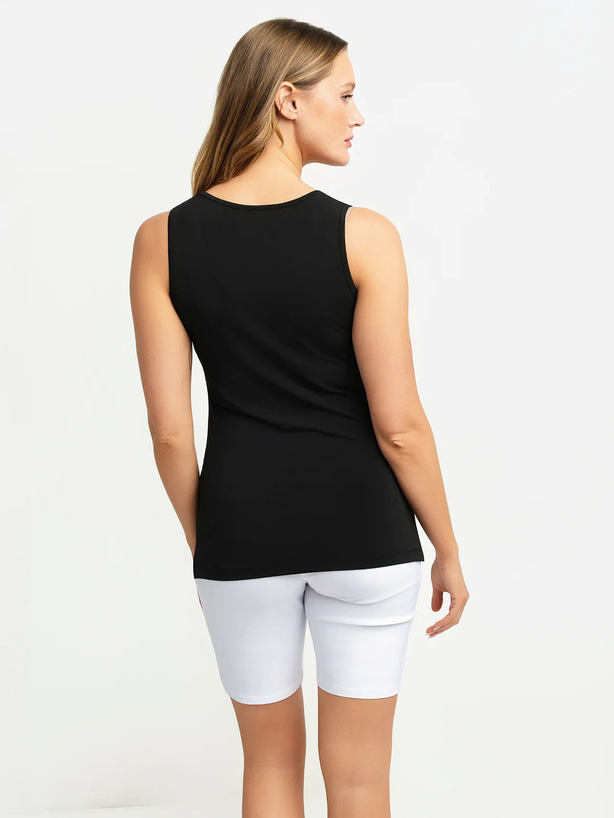 Camisole unie avec encolure arrondie et de larges bretelles. Conçu en textile lisse extensible, le modèle présente une coupe ajustée, une petite fente latérale et une longueur couvrant les hanches.