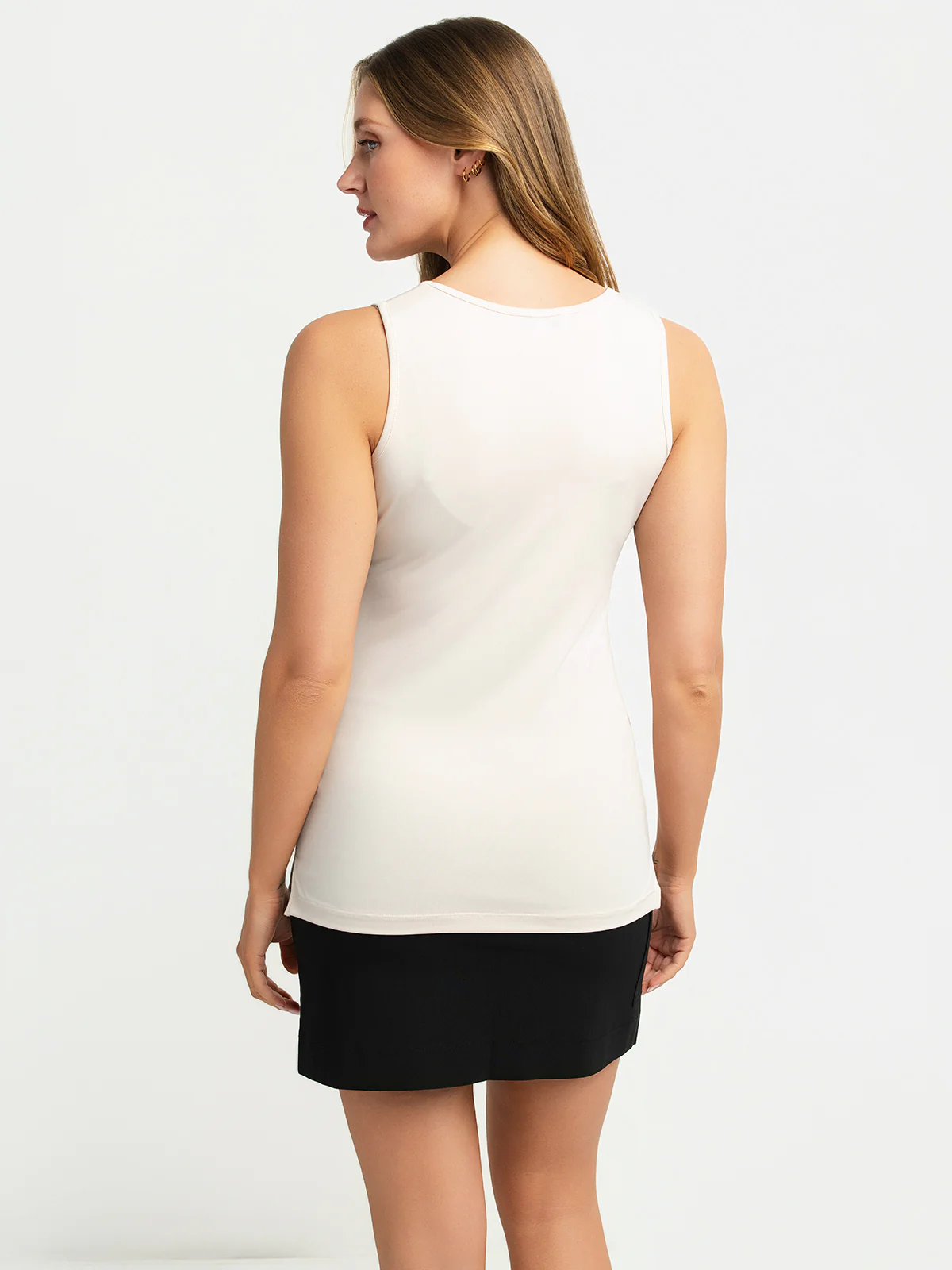 Camisole en textile extensible lisse avec coupe ajustée. Elle présente une encolure arrondie, de larges bretelles et des fentes latérales en bas de corps.