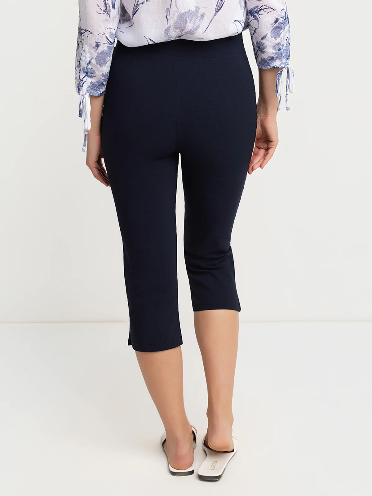 Capri en textile extensible uni. Il présente une taille haute avec ceinture large et une coupe ajustée.