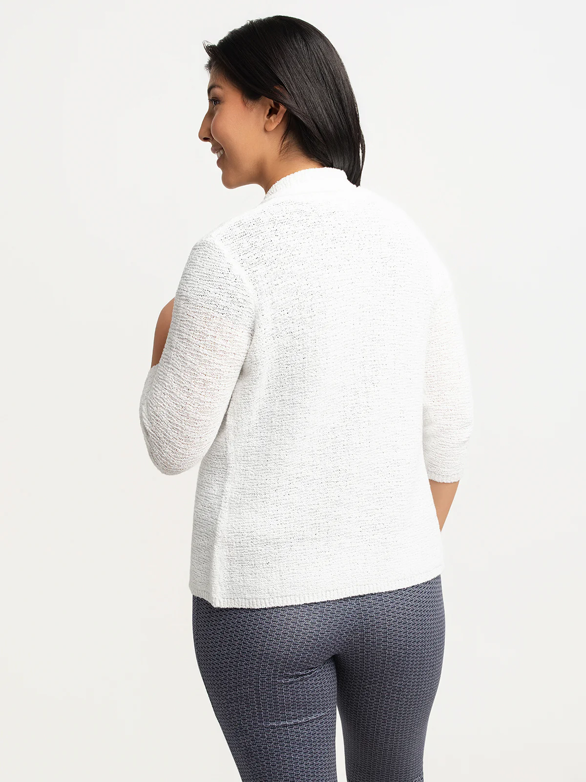 Cardigan à manches 3/4 en tissu tricoté à texture fine. Il présente un col châle continu et une longueur hanches.