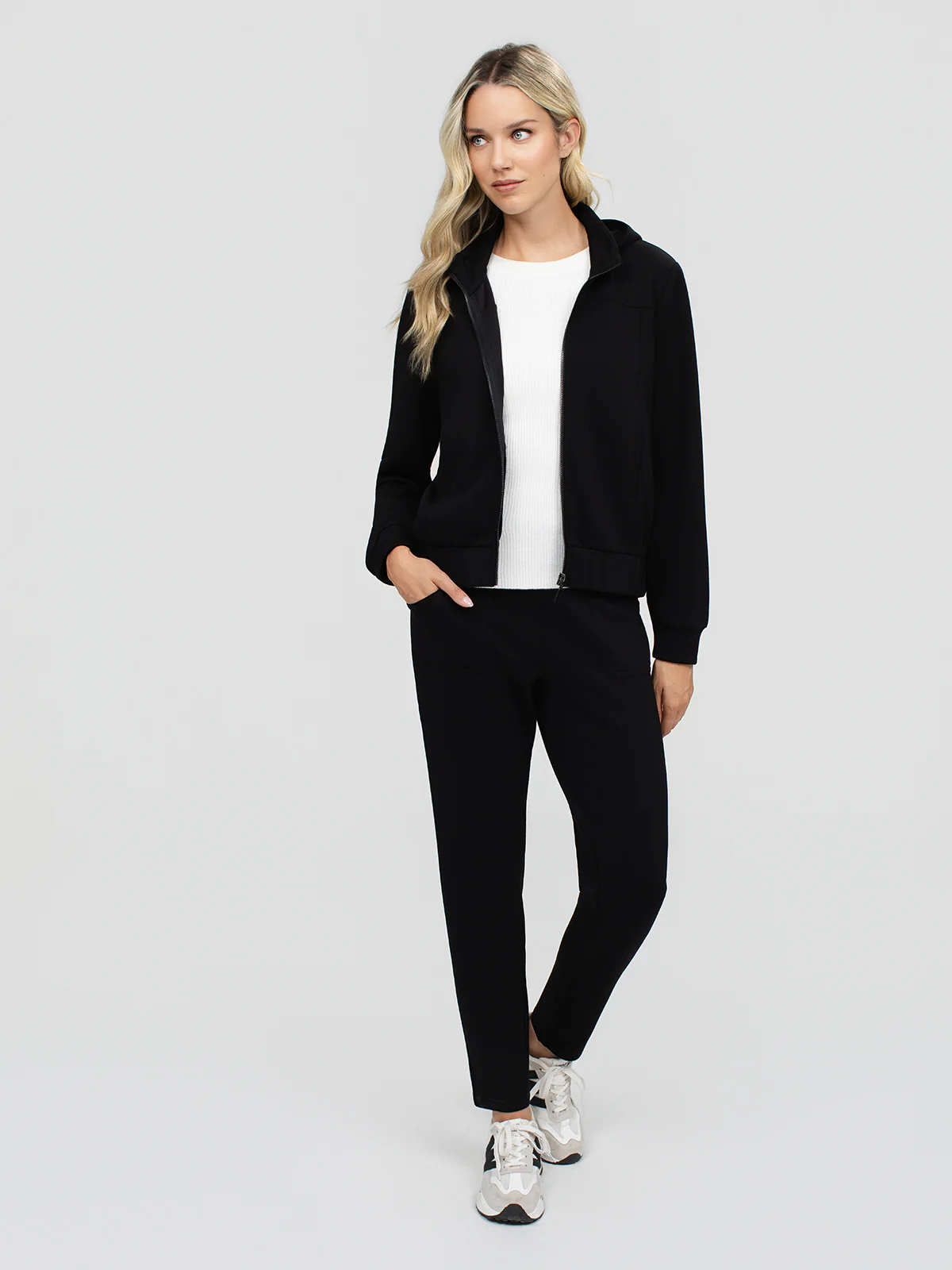 Chandail à capuche noir avec manches longues et deux poches avant. Ourlets et poignets côtelés.