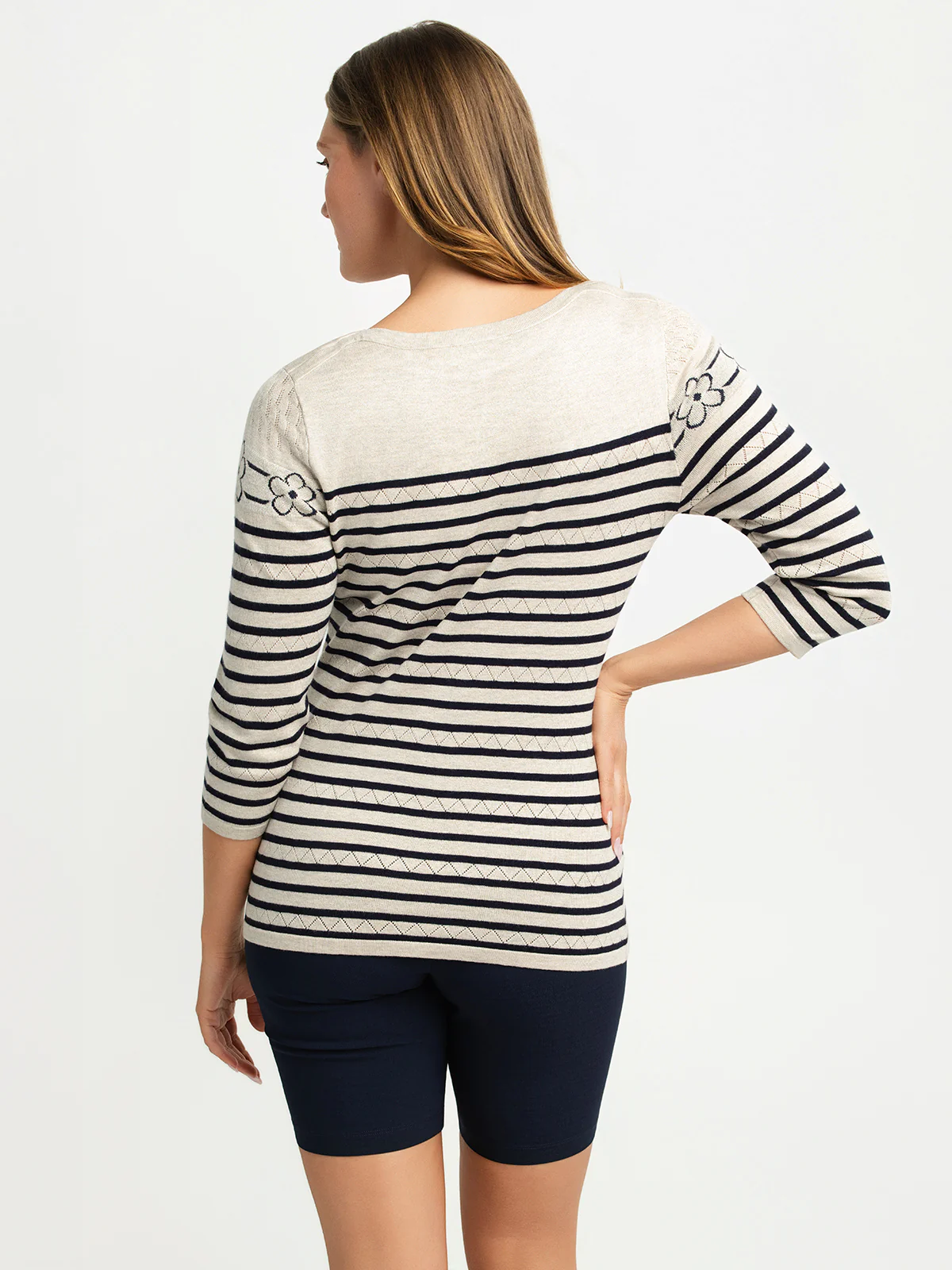 Chandail à manches 3/4 avec motif à rayures horizontales contrastées sur l’ensemble du vêtement. Il présente un col rond et une construction ajourée discrète intégrée entre certaines bandes.