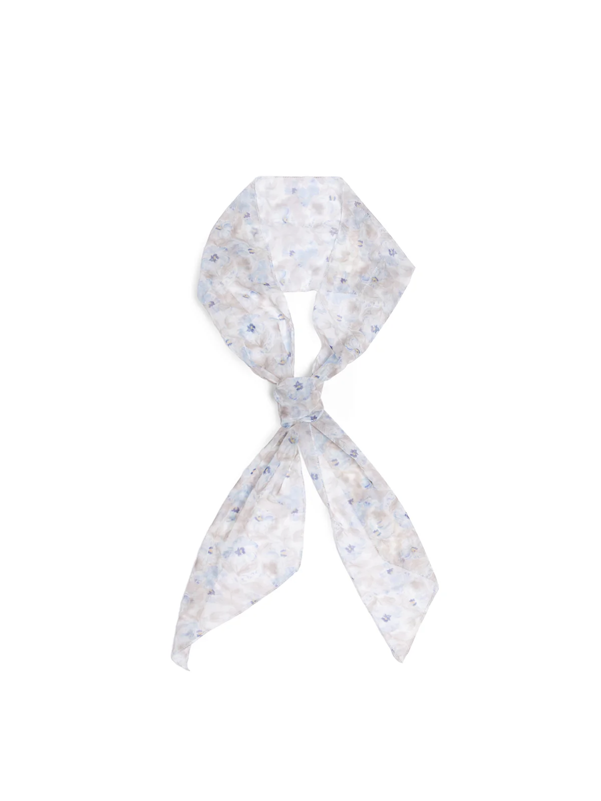 Foulard rectangulaire confectionné en textile léger à imprimé floral. Conçu pour être porté noué autour du cou, dans les cheveux ou sur un accessoire.