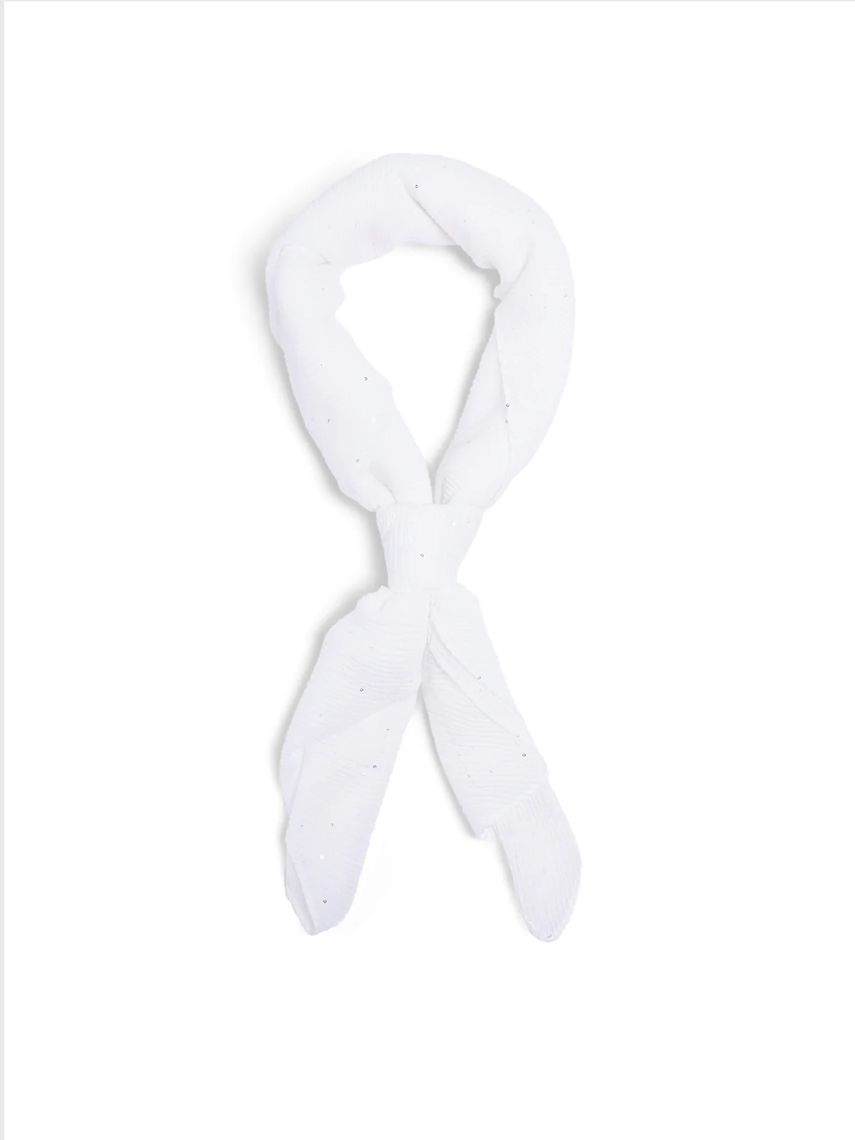 Foulard rectangulaire confectionné en textile léger à surface légèrement structurée. Il présente une finition unie avec de petits éléments décoratifs discrets répartis sur l’ensemble.