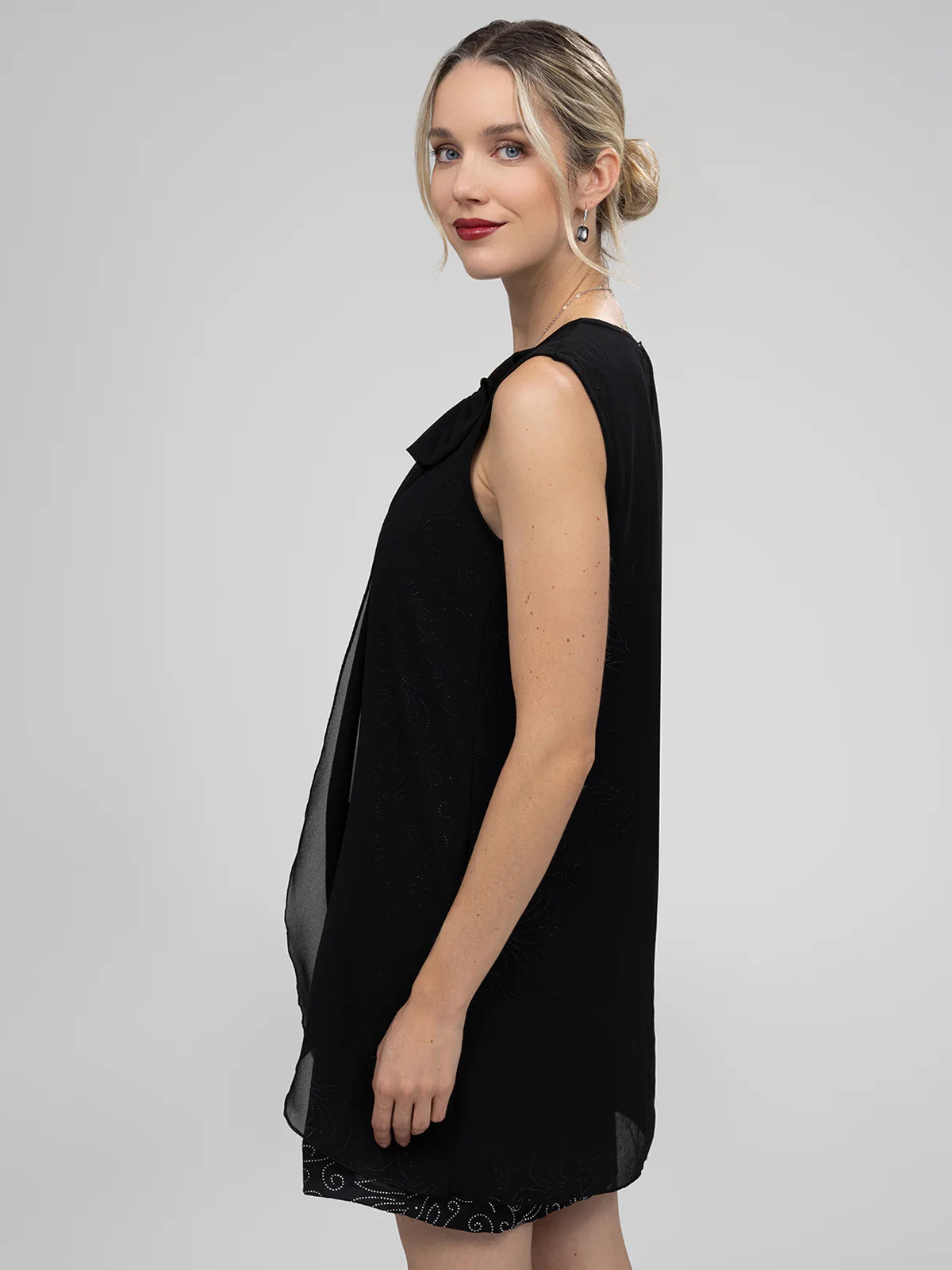 Robe à bretelle larges composée d’un tissu léger noir formant un drapé asymétrique fixé par un nœud sur l’épaule droite. Une couche intérieure plus courte, décorée de motifs floraux, dépasse légèrement au bas.