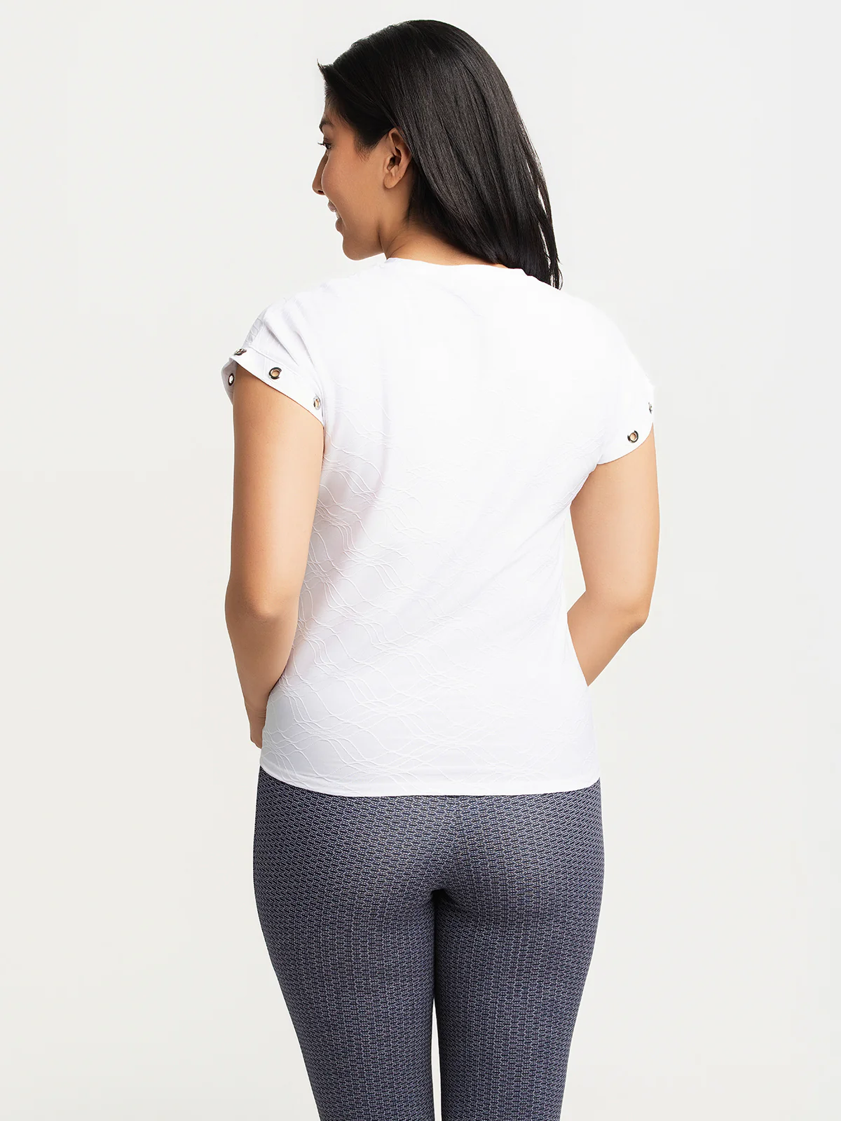 T-shirt présentant un col rond orné d’œillets métalliques, des manches courtes avec œillets assortis et un lien noué sur le côté de l’ourlet.
