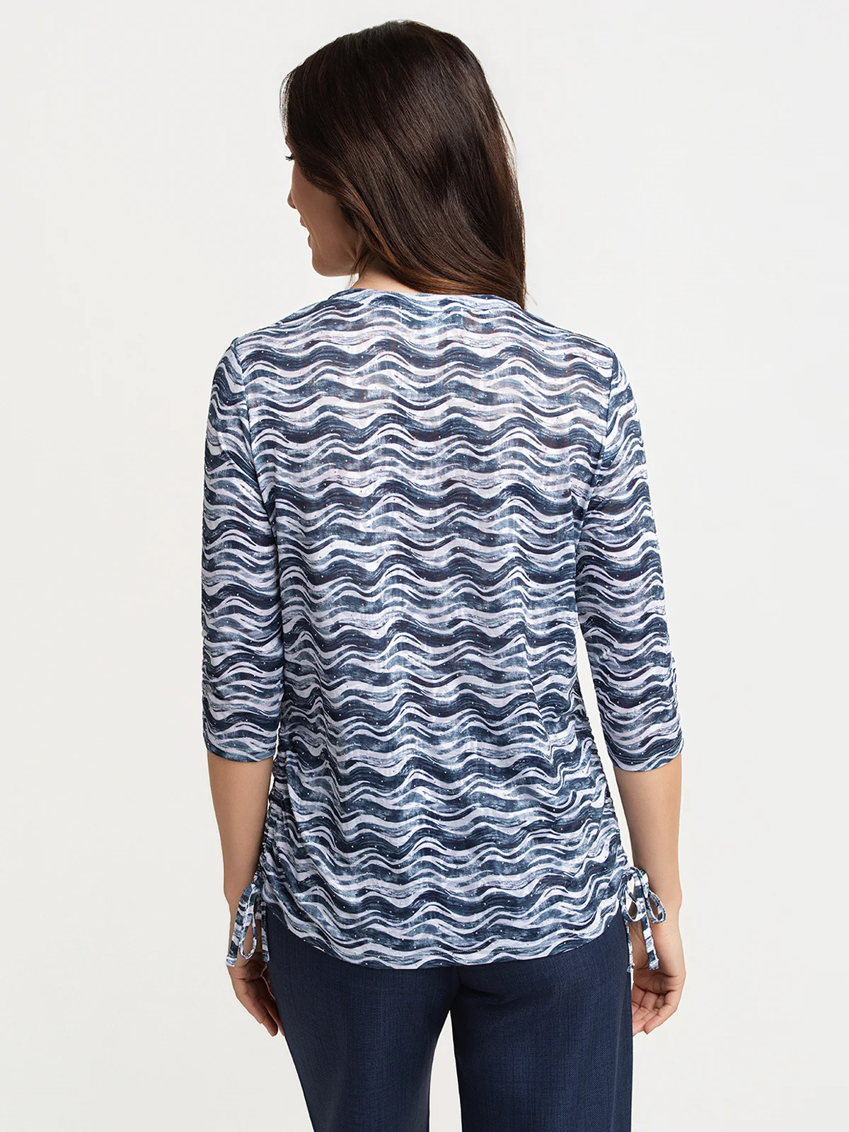 Tunique à manches 3/4 en textile léger à imprimé ondulé. Elle comporte une encolure ronde, des manches trois-quarts et un lien de serrage latéral au bas.