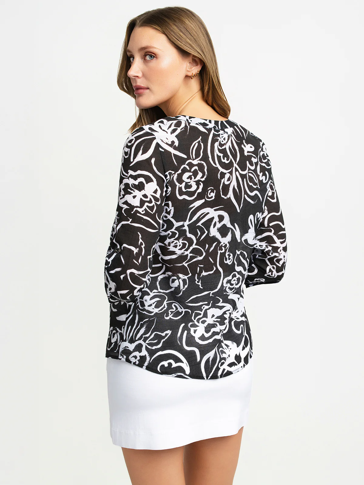 Tunique en tissu léger imprimé à motifs graphiques contrastés. Elle présente un col en V avec patte de boutonnage sur le devant et des manches 3/4.