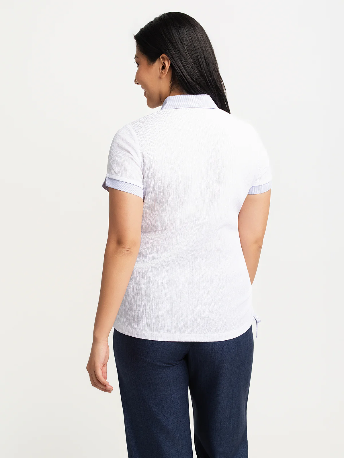 T-shirt à manches à surface texturée. Il présente une encolure ronde intégrant un empiècement de chemise à col polo rayé avec patte de boutonnage et un lien de serrage latéral à l'ourlet.