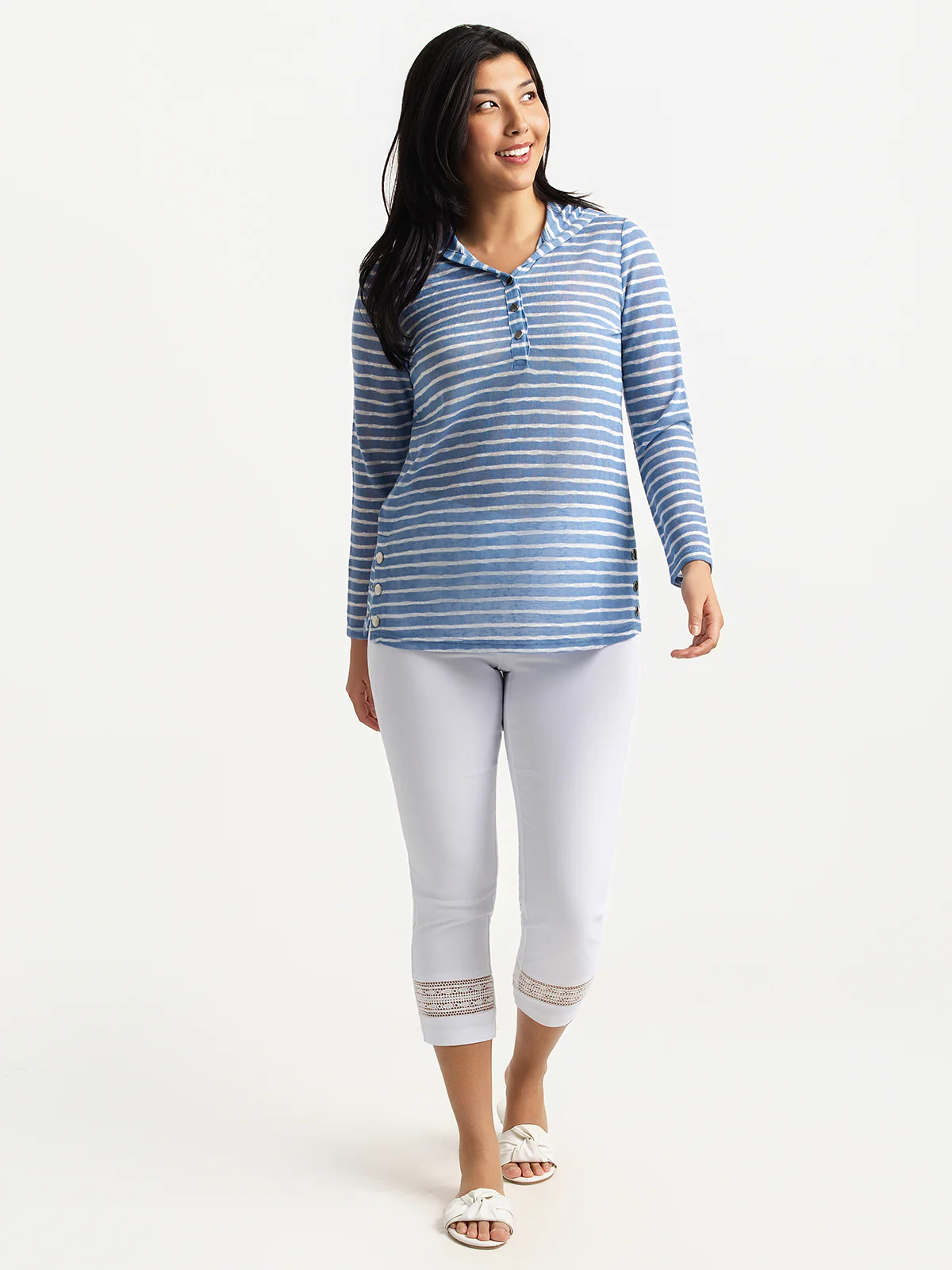 Chandail à manches longues avec capuche en tissu tricoté avec rayures horizontales. Il présente une encolure en V avec patte boutonnée, une capuche montée et une longueur hanches avec fentes latérales boutonnées.