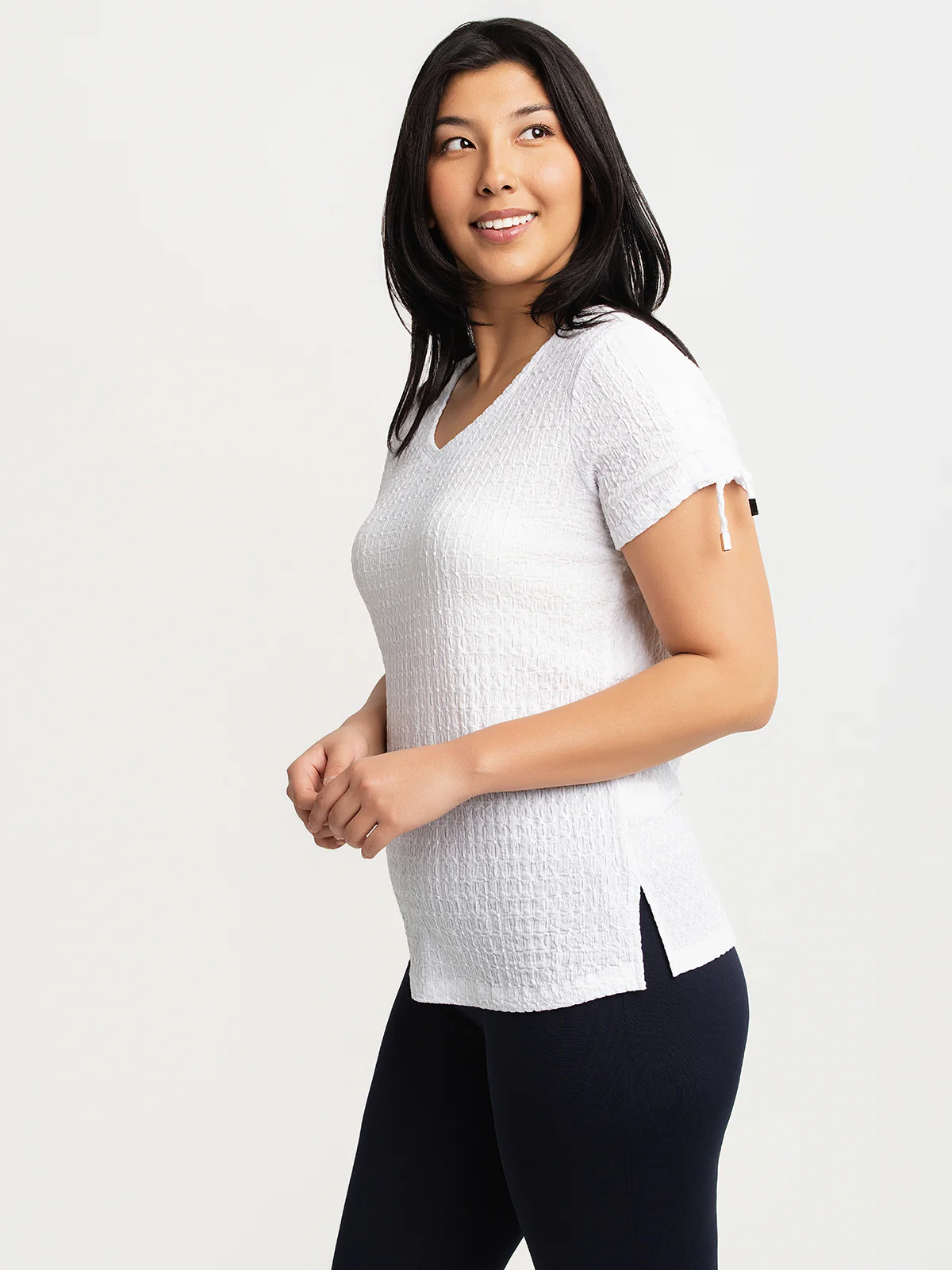 T-shirt à manches courtes réalisé en tissu tricoté à texture gaufrée. Il présente une encolure en V, des manches avec lien de serrage discret et une base droite avec fentes latérales.