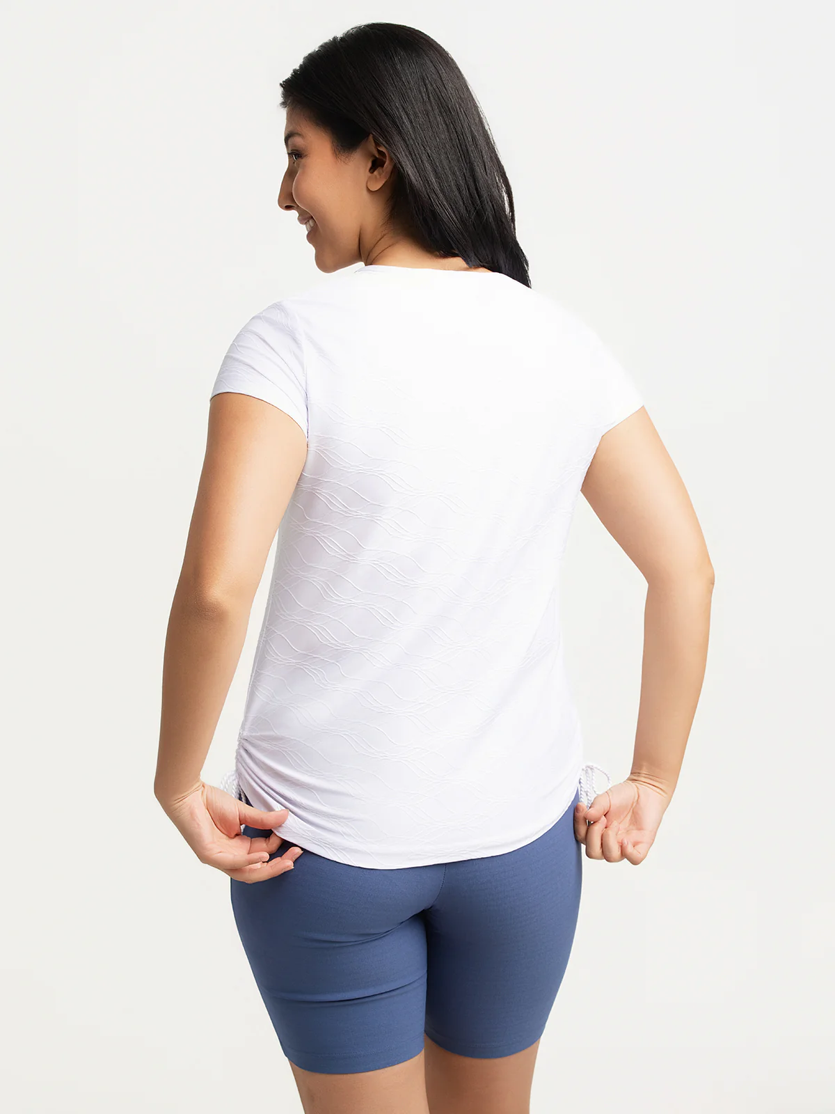 Chandail à manches courtes en tissu texturé avec motif discret en relief. Il est doté d’une encolure ronde fendue avec laçage décoratif, de manches montées, d'un ourlet arrondi et d’un lien de serrage latéral à la base permettant un ajustement personnalisé.